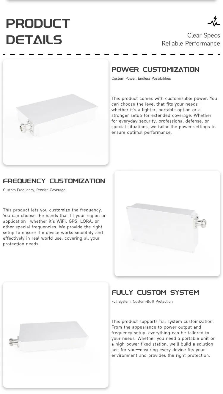 100–900 MHz • 100 W GaN RF jammer module for authorized Counter-UAS integrators and licensed labs. Covers key sub-GHz control bands (e.g., 150–174, 300–380, 400–470, 860–880, 902–928 MHz families) via factory tuning for real, repeatable performance. Shielded aluminum body, SMA-F RF port (N-F optional), 12–24 V DC input, and thermal/over-current/VSWR protection. Optional dual-path (100–400 + 400–900 MHz) combiner version available on project order.