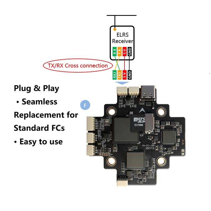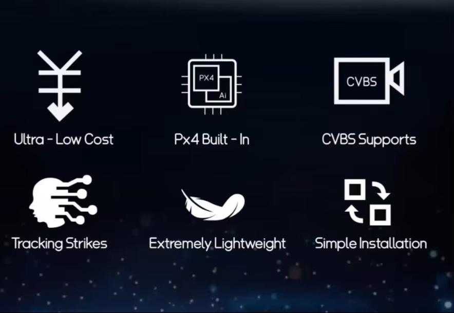 Plug-and-play 2-in-1 PX4 flight controller with integrated AI vision tracking. Drop-in replacement for mainstream FCs—standard ports, no retraining needed. Works with analog FPV (CVBS) cameras, supports ELRS (CRSF) receivers and GPS. The on-board AI engine enables object detection, lock, and track-assist with simple mode control. Ultra-light, 2 W typical, single-board design.